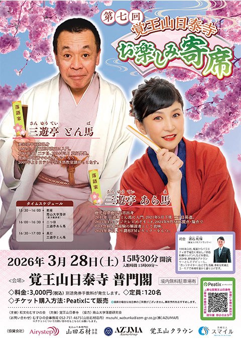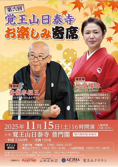 お寺の厳かな雰囲気の中で、笑いと癒しのひとときをお過ごしください。皆様のご来場を心よりお待ちしております。
